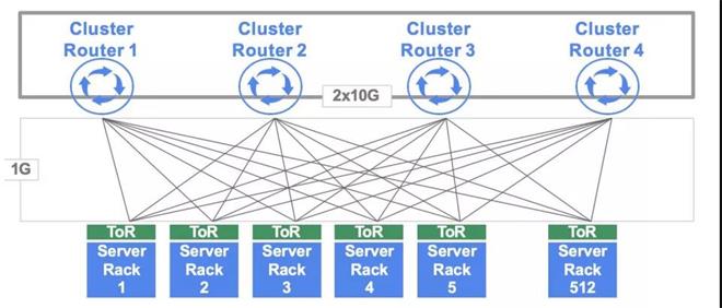 传统大规模数据中心从4-POST(2004 年设计)演变而来,Google 最早采用4个大型交换机(路由器,Cluster Router)来连接 512 个 TOR 机柜交换机,每个 Cluster Router16 槽位 x 32 端口能提供512个1GE到TOR(Top Of Rack 机柜顶端交换机)。每个TOR接到4个Cluster Router 提供多上行冗余。