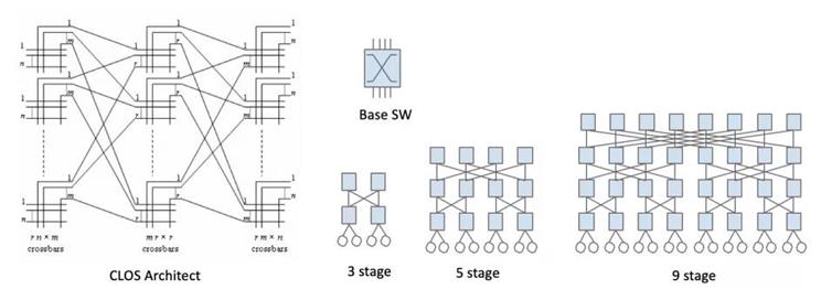 CLOS 网络架构的级数Stage,是基于路径上经过多少跳。比如上图中的3-stage 是最简单的,Leaf/Spine两层,但是从一个服务器到另一个机柜的服务器,经过三跳。以此类推,5-stage 是三层,9-stage是四层架构。