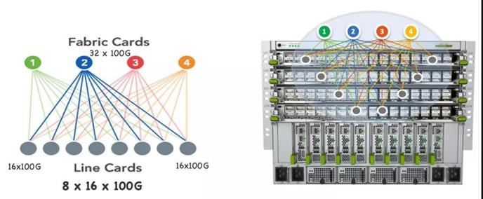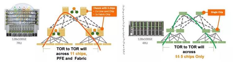 128端口扇出,无阻塞,空间占比更优(7RU vs 12RU),板卡级别共享风扇/电源模块。