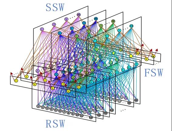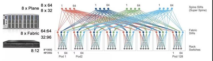 FSW(Fabric Switch):每个平面最多128台 FSW ,16台Fabric交换机分别上联到 16个平面的Spine Switches,Spine平面是完全隔离的。