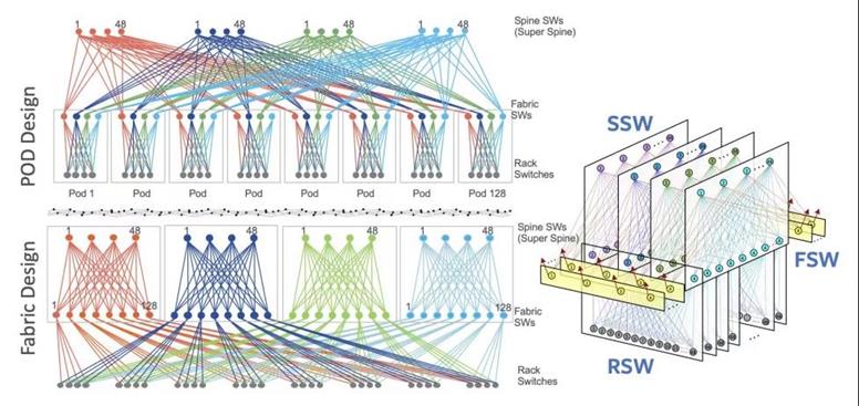 RSW(Rack Switch):保留每个POD 48台TOR 交换机汇聚到16台Fabric Switches 分属16个不同的平面;POD可以横向扩展Scale Out。最多128个 POD。