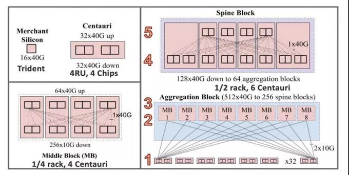 Google在2016年揭晓了基于Trident芯片 16x40GE 设计的 Jupiter 40G Fabric 数据中心架构。实际当年应该已经规模部署 32x100GE 架构(Google一般揭秘2-5年之前的前代技术)。Jupiter 架构设计中,采用四个Trident芯片来构建Centauri(半人马),四个Centauri组成一个Middle Block,6个Centauri 组成一个Spine Block。从芯片的角度其实是5层 9-Stage CLOS架构。