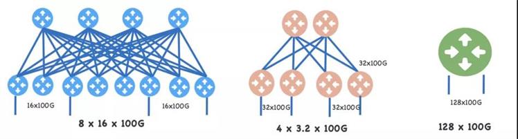为了提供128x100GE接口能力,如果采用3.2T芯片,需要4(Spine)+8(Leaf)共12颗芯片的 架构,每个leaf 提供16x100GE接入Fabric Spine还有16x100GE用户接入。如果采用3.2T Pizzabox实现同样用户接口能力,总共需要12个3.2T的盒子(12RU)。