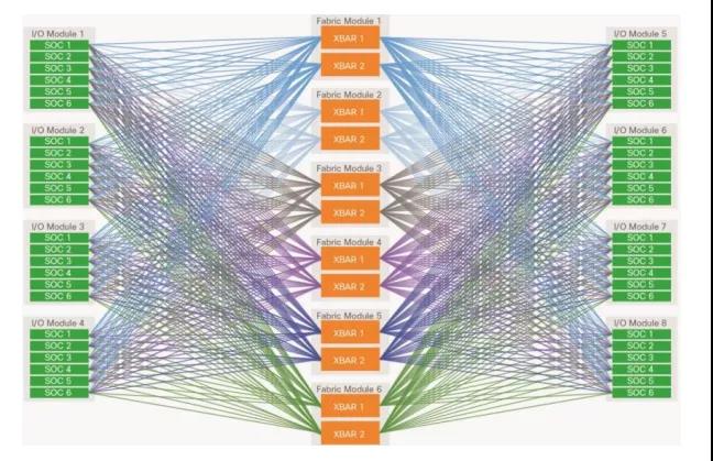 比如Cisco的 Nexus9K 产品架构如图(参见 Cisco 白皮书),早期的多槽位交换机,每板卡上有6个ASIC,8个槽位48个芯片(Leaf)连接到 Cross BAR(Spine)。整个交换机是一个12+48的Leaf/Spine Fabric 系统。