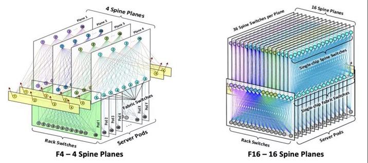 F4 秉承 4-Post 的设计理念,把 4 Post 的四个大路由器替换成四个 Fabric 平面。用 128 端口的Leaf/Spine Fabric 来代替超大型单台多槽位交换机实现 Scale Out 设计。