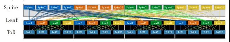 由于单机柜服务器流量增长,4x100GE 每机柜不能满足要求,新的设计RSW有更多的 16x100GE上行。因此架构上从4个Spine平面,增加到16个Spine平面,并且进行了一些微调。