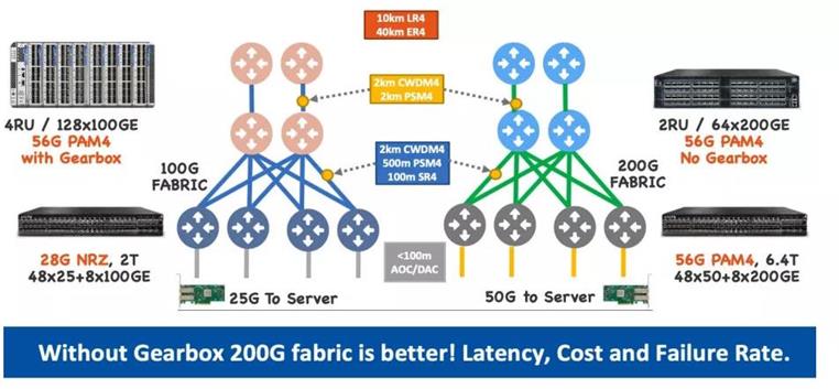 56G PAM4 芯片成熟,网卡/光模块/交换机 ASI三种芯片都全面支持56G PAM4,从服务器到Fabric设备不需要添加额外的Gearbox,时延降低,成本降低,设备出错概率降低。
