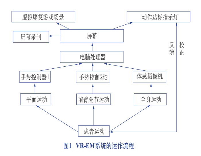 为了让患者在轻松愉悦的氛围中完成各种肢体功能锻炼,在VR-EM系统中整合了多款肢体训练游戏,例如有训练上肢伸腕运动的虚拟钢琴弹奏,控制上肢平衡及协调能力的青蛙跳小游戏,还有虚拟人的实时“监督”。这种多感官刺激加强了患者的沉浸式体验,也有利于增强患者的兴趣,消除负性情绪。这将改善临床康复锻炼过程的枯燥感,促进患者锻炼依从性的提高。通过调整体感设备和患者之间的距离,体感设备可稳定捕捉患者的肢体动作,并把数据实时传入患者面前的电脑中,并在屏幕中虚拟人清楚显示患者的实际运动情况,实现了运动的可视化。