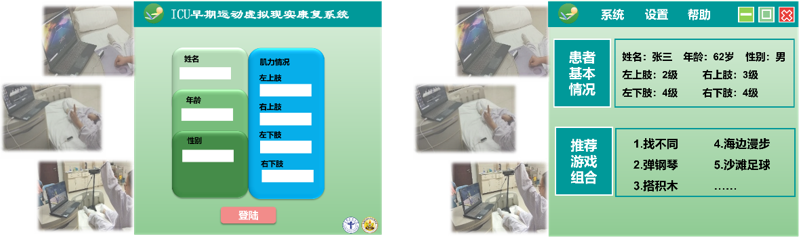结合多种体感设备,借助虚拟现实技术开发的,以促进RICU患者早期主动运动为目的的康复系统包括两个部分。