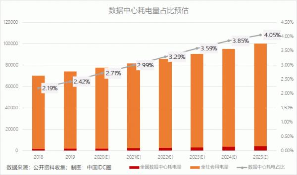 2018年,全国数据中心总耗电量1500亿千瓦时,达到了社会总用电量的2%。预计到2025年,占比将增加一倍,达到4.05%。
