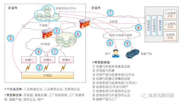 工厂网络与互联网的融合使工业互联网呈现以3类企业主体、7类互联主体、9种互联类型为特点的互联体系。