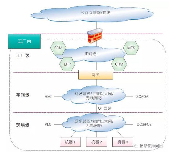 总体来看,工厂网络呈现“两层三级”的结构。“两层”是指存在“信息技术(IT)网络”和“操作技术(OT)网络”两层技术异构的网络;“三级”是指根据目前工厂管理层级的划分,网络也被分为“现场级”、“车间级”、“工厂级/企业级”3个层次,每层之间的网络配置和管理策略相互独立。