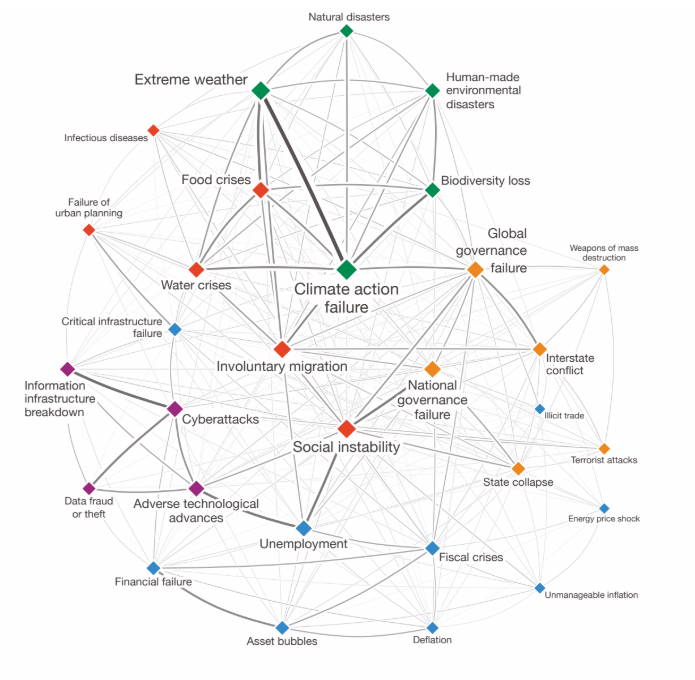 世界经济论坛2020全球风险报告:全球风险关系图(紫色为技术风险)