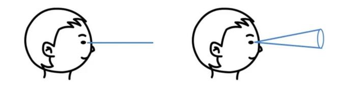 视线与物体进行碰撞检测时,不要真的将视线视为一个无限细的射线进行检测,因为基于目前眼球追踪技术,是无法做到100%准确,会存在一定的误差,虽然误差值很小,但是为了避免这种误差造成交互失误,在进行碰撞检测时,视线一方的碰撞物体,一般需要设置一定的扩展范围,最好是将视线设置为一个圆锥形,这样无论碰撞的距离是多少,其检测范围的半径是不变的。