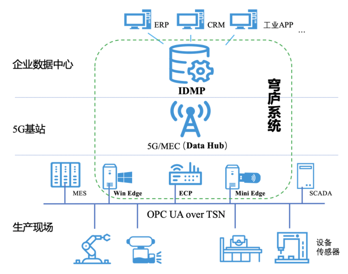 应用5G、边缘计算、工业互联网技术与包括IDMP工业数据管理平台在内的穹庐系统结合,构建智能化、数字化工业企业。生产现场装有ECP(Edge Computing Platform)的边缘智能网关提供现场级边缘计算能力,通过OPC UA协议与TSN(实时以太网)与厂区的各类工业设备以及MES(生产管理系统)、SCADA(数据采集与监视控制系统)联通,满足工业现场控制实时性要求。5G基站除了提供高速5G通信外,还通过部署于MEC上的Data Hub提供网络侧的边缘计算能力支持。IDMP工业数据管理平台,纵向连接5G基站的Data Hub、厂区的ECP,穹庐系统各个组件协同下实现工业数据从生产现场到企业IT网络的垂直贯通。IDMP通过严格精细的权限控制、传输加密、质量校验、留痕审计等措施,在企业内部建立安全、可靠、有效的数据流通及管理框架。生产设备数据脱敏过滤上传到企业数据中心,为人工智能、大数据等工业应用带来数据活水,对工艺的智能不断挖掘,形成新的制程工艺决策支持,带来质量的稳定性、良品率的上升。IDMP赋予工业数据语义互操作性,与穹庐系统其它组件协作将企业IT与OT数据打通融合,助力实现企业供应链协同,也为工业APP创新奠定了基础。