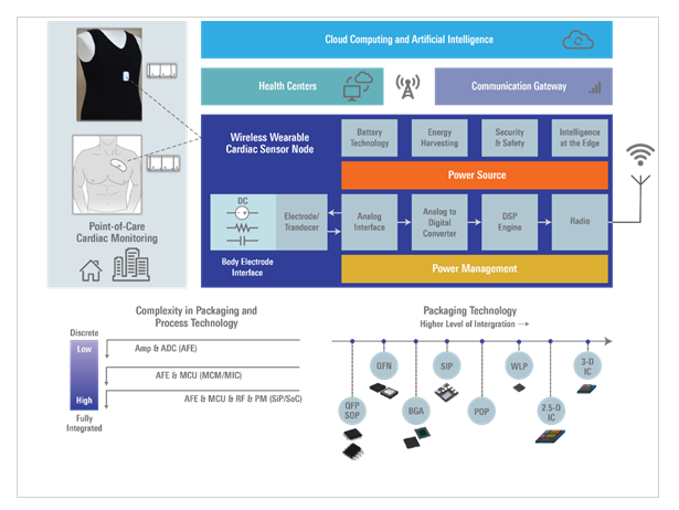 通过心电图(ECG)传感器节点(例如ECG贴片或心率监测导电服装)和数据管理服务在数据中心收集可穿戴设备传来的心脏数据。通常,传感器节点为一导联或三导联ECG监测设备,最多包含三个电极(湿式或干式)连接至贴片上的电子器件。