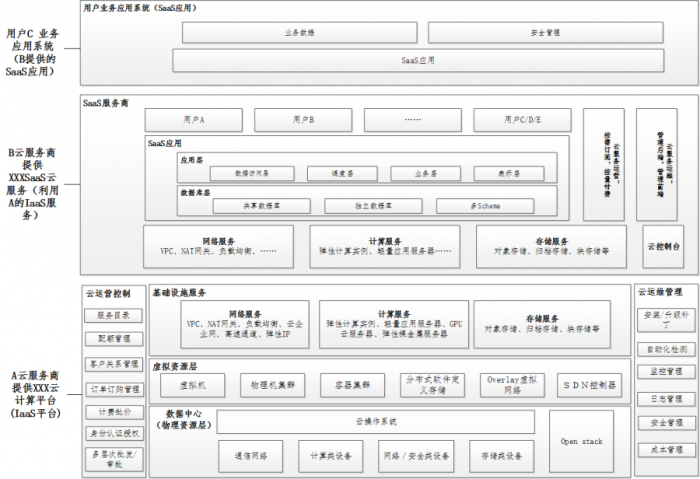 A云服务商为云服务客户B提供基础设施服务(计算/网络/存储),B利用A提供的IaaS服务为用户C提供SaaS服务。
