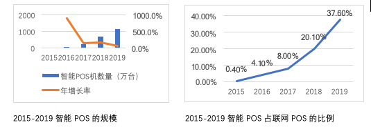 在电子券、二维码等新型支付方式出现前,传统的POS也可以满足人们的日常支付的需求,但随着二维码支付的普及,智能移动支付终端的数量呈现出井喷式的发展。据易观数据统计,智能POS的数量从2015年的10万台增长至2019年的1166万台,2015-12019的年复合增长率高达228%;并且智能POS的增长率高于总的POS的增长率,智能POS的数量占联网POS机总量的比例从2015年的0.4%增长至2019年的37.6%。