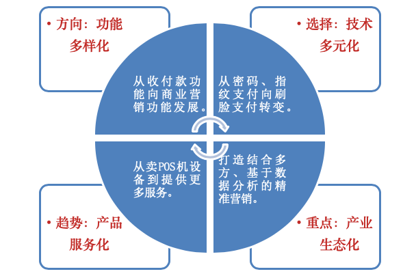 根据中国移动网预测,到2023年后,智能支付终端将基本完成对传统POS的更替。从目前移动支付行业的发展现状,结合智能POS机行业各企业的发展方向,未来的智能POS机行业将向着功能多样化、技术多元化、产品服务化、产业生态化等方向发展。