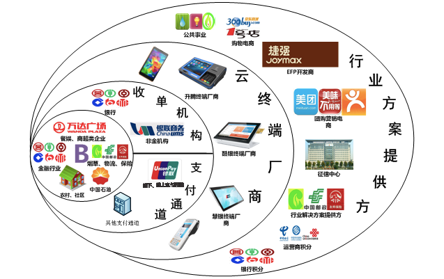 生态系统可以整合各行业优质互联网+应用厂商资源,为线下实体商户提供一整套从繁杂支付手段到智能POS聚合支付,从聚合支付到聚合会员、从到店经营到线上互动引流、利用数据分析精准营销的综合解决方案,从而搭建起基于数据、个性化服务、多样的商业模式。