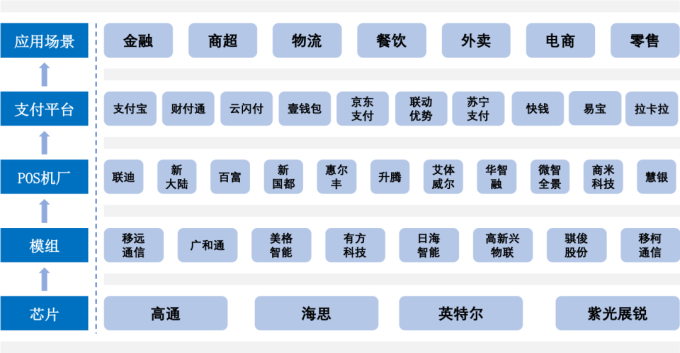 整体来看,智能POS机产业链包括芯片、模组、POS机厂、支付平台、应用场景等多个组成部分。