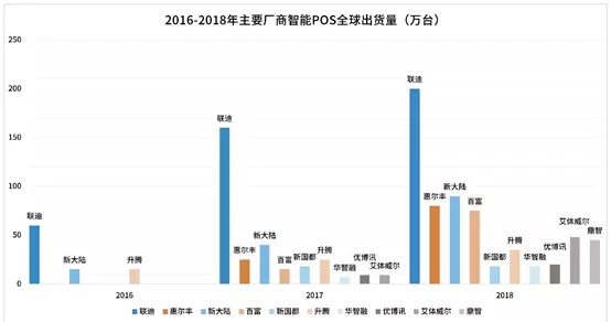 图11 2016-2018年主要厂商智能POS全球出货量(来源:移动支付网)