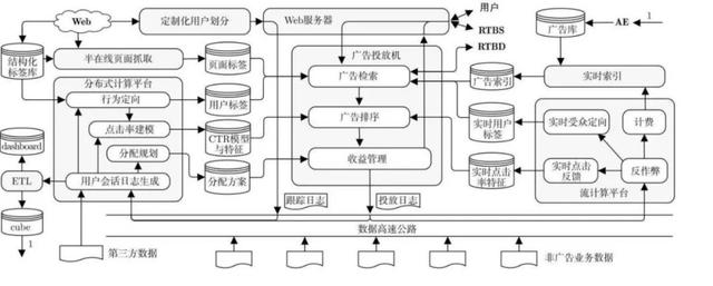 阿里的搜索、推荐和广告也是非常典型的大数据应用的场景(高维稀疏业务场景),在谈如何测试之前我们需要先了解一下平台处理数据的工程技术背景。搜索、推荐、广告系统在工程架构和数据处理流程上比较相近,一般分为离线系统和在线系统两部分,见下图 1(在线广告系统一般性架构,刘鹏《计算广告》)。离线系统负责数据处理与算法模型的建模与训练,而在线系统主要用以处理用户的实时请求。在线系统会使用离线系统训练产出的模型,用以实时的在线预测,例如预估点击率。