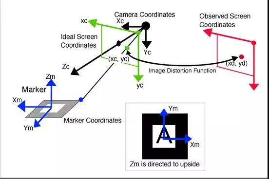 这种实现方法需要一个事先制作好的Marker(例如:绘制着一定规格形状的模板卡片或者二维码),然后把Marker放到现实中的一个位置上,相当于确定了一个现实场景中的平面,然后通过摄像头对Marker进行识别和姿态评估(Pose Estimation),并确定其位置,然后将该Marker中心为原点的坐标系称为Marker Coordinates即模板坐标系,我们要做的事情实际上是要得到一个变换从而使模板坐标系和屏幕坐标系建立映射关系,这样我们根据这个变换在屏幕上画出的图形就可以达到该图形依附在Marker上的效果,理解其原理需要一点3D射影几何的知识,从模板坐标系变换到真实的屏幕坐标系需要先旋转平移到摄像机坐标系(Camera Coordinates)然后再从摄像机坐标系映射到屏幕坐标系。