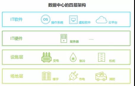 数据中心具有房地产和IT的双重属性,其可从场地到IT软件分为四层,每上升一层其地产属性会更弱、而IT属性会更强。大多数的数据中心到设施层即止。提供IT硬件时,业务即开始向服务器租用转变。提供IT软件时,一般即转型为公有云或者专有云的云厂商。