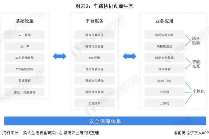 车路协同创新生态,主要分为三个部分。在基础能力层面,车路协同的落地实施需要依托人工智能技术和云计算资源为车路协同打造闭环能力。同时,随着5G的快速普及,基于边缘计算的车联网V2X架构将在出行场景有着广阔的应用。在平台服务层面,模拟仿真服务、高精地图服务、MEC开源服务、自动驾驶服务等应用环境,为车路协同提供技术支持和应用落地,有效提升车路协同的安全性和效率。在业务应用层面,基于场景驱动、智能交互、个性化推荐服务等应用,可以进一步加强对用户需求的理解,以及对真实时间和空间场景的理解,一方面向用户及时推送实时路况信息、高精定位、辅助安全驾驶等能力,另一方面结合具体应用场景,把互联网的相关服务直接面向客户主动推送,从“人找服务”向“服务找人”进行转型。