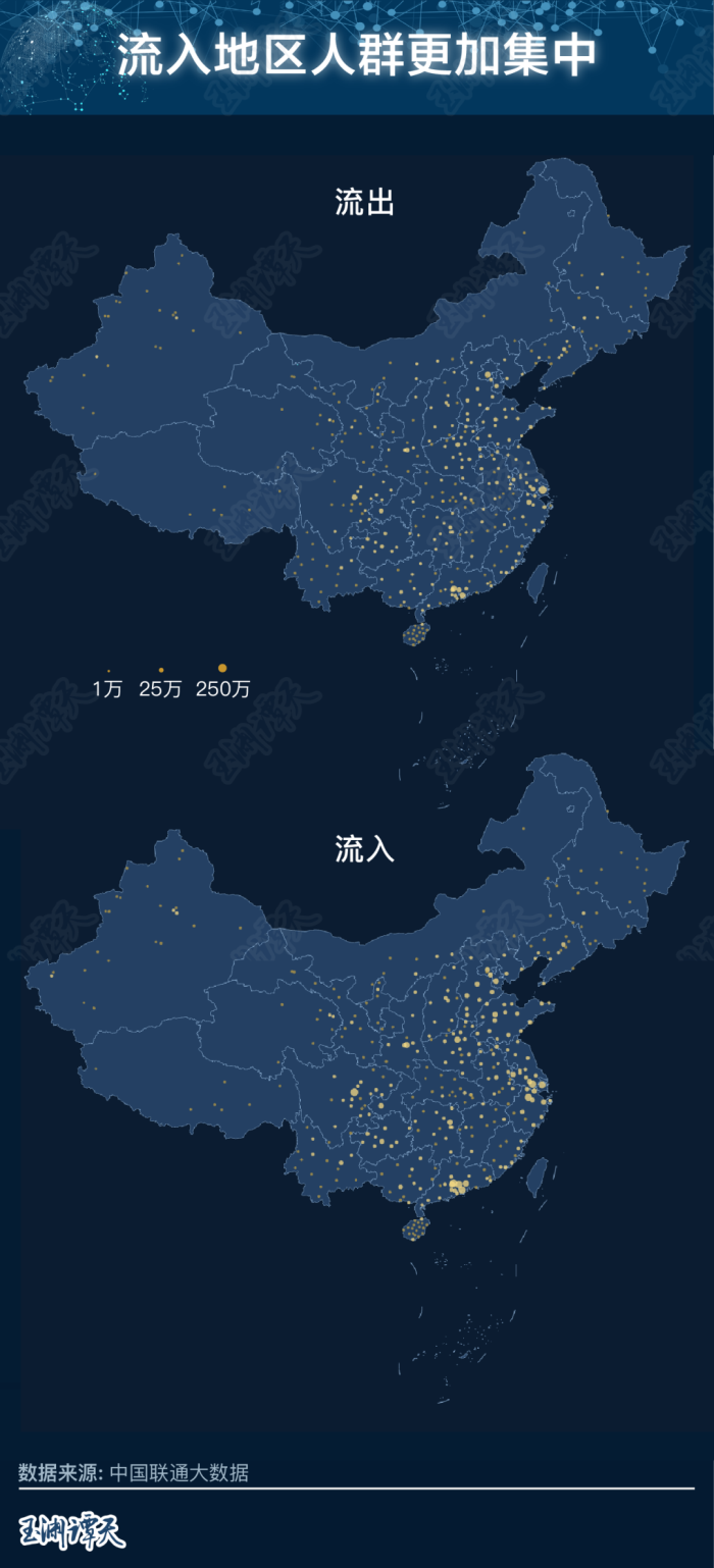 我们将300多个地级及以上城市、省直辖县一起在地图上铺开,用气泡的大小来表示人流量多少。