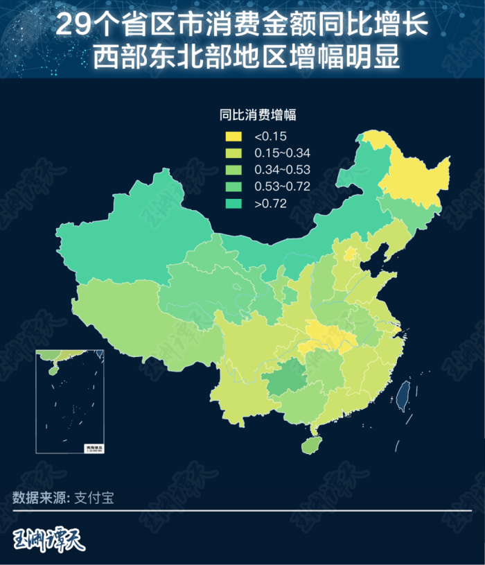 支付宝的数据显示:总消费额度也超过去年。全国29个省区市消费金额完成了同比增长,内蒙、新疆、青海甚至出现超过60%的高增长。