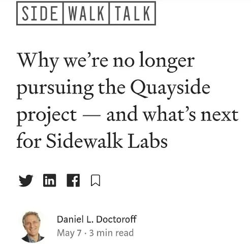 除了一些表示遗憾的套话,这篇文章透露出的主要问题是:这个项目在财务上已经变得不太可行。文章指出,过去两年步道实验室在多伦多投入了大量人力和资源,但是由于疫情,全世界房地产市场(当然也包括多伦多)“都面临前所未有的经济不确定性”,因此他们内部评估,觉得在满足多伦多政府要求的前提下,这个项目“在财务上想要可行已经太过困难”,所以不再有意义——简单来说,就是无利可图,做下去也只能是亏本了。