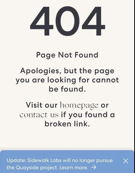 直到今年2月,步道实验室官网仍然在更新他们对多伦多智慧城市的设想。现在,这一切雄心壮志都不再被提起,官网上那个200页的pdf文件页面也变成了“404,网页未找到”,在页面的右下角,有一条不大的通知,写着:“步道实验室将不再推进该项目”。