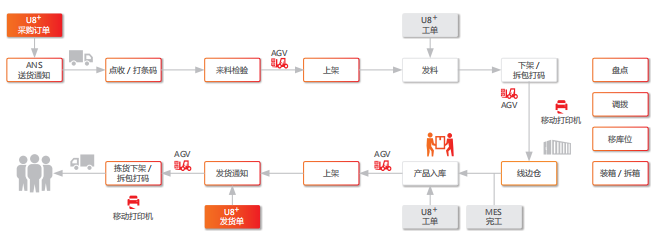 ●通过条码技术集成 WMS 仓库收、发作业条码扫码生单自动同步到 U8+,结合先进先出与拣货货位智能计算、智能拆包应用,提升出 入库操作效率,并加强防呆防错。