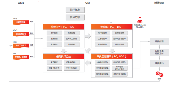 ●工序 / 完工检验:现场扫码检验,实现不良品处理、返工流程、返工单闭环集成处理。