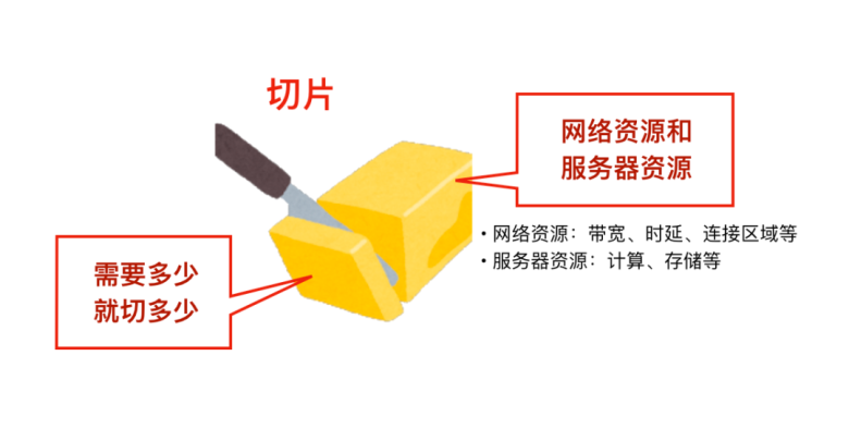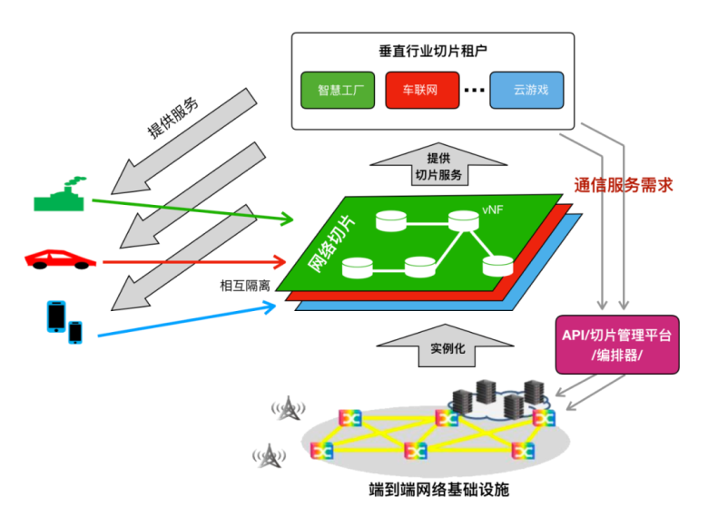 就是根据不同行业应用对网络带宽、时延、安全性、可靠性、地理覆盖范围等SLA需求,从端到端网络基础设施上按需 “切”出多个相互隔离的、安全的、SLA可保障的逻辑网络。