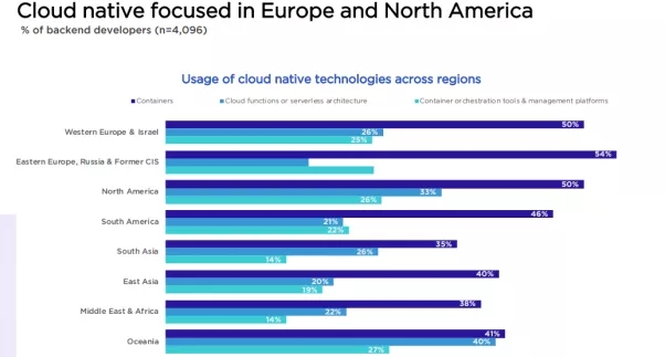 总的来说,欧洲和北美的容器使用率远超亚洲。容器的使用已在东欧得到普及,54%的后端开发人员使用容器。北美和西欧等发达地区的使用率也很高。在北美、西欧和以色列,一半后端开发人员都使用了容器。同时在三个地区内,25%-26%的后端开发人员采用编排技术来管理这些容器。