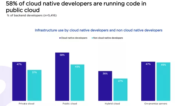 与未参与云原生的开发人员相比,云原生开发人员掌握的计算基础架构确实更多。这些开发人员更加愿意在私有云、公共云、混合云和本地服务器等四种环境中运行代码,且平均使用了1.8种环境,而未参与云原生开发人员的平均值为1.5。数据显示,270万云原生开发人员(58%)在公共云上运行后端代码,220万开发人员(47%)选择了私有云,选择本地服务器的开发人员为220万(47%),而选择混合云的开发人员为170万( 36%)。