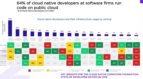 例如,与本地服务器或私有云相比,软件公司更倾向于在公共云中运行代码。在软件公司工作的云原生开发人员中,近三分之二在公共云中运行代码,同时该行业一半的开发人员在私有云上运行代码。