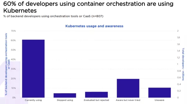 凡是对容器和云原生技术感兴趣的开发人员都知道Kubernetes,因为它已成为编排的行业标准。但是,我们的研究表明,也并非所有开发人员都在使用Kubernetes,尽管大多数确实在使用。60%的开发人员在使用编排引擎或CaaS,而使用Kubernetes的开发人员高达170万。编排用户中有30%知道Kubernetes,但没有使用它,其余10%的人甚至不知道Kubernetes。