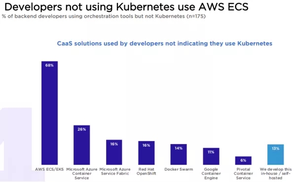 我们的分析还显示,在使用编排的开发人员中,21%仅使用了CaaS,而没有使用Kubernetes。随着市场的标准化,Kubernetes成为运行CaaS的底层编排引擎,这21%的人可能需要进一步探索。