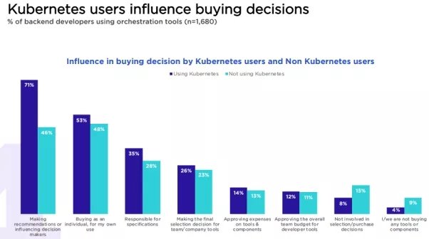 在使用Kubernetes的开发人员中,71%的人提出了建议或影响了决策者。这比没有使用Kubernetes的开发人员高25%。