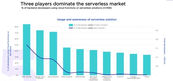 尽管亚马逊在使用方面遥遥领先,但其竞争对手Google Cloud Functions和Azure Functions的人气很接近。即使有些开发人员知道Google和Azure提供的Serverless产品,但他们还是选择了AWS Lambda。根据我们的研究,Lambda持续受欢迎的两个重要驱动因素是其易用性和可扩展性。