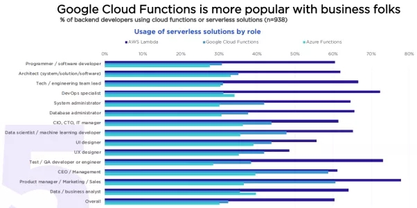 亚马逊是程序员和软件开发人员这个社区的领导者,占Serverless用户的80%。在软件开发人员中,Lambda和Google Cloud Functions的使用分别占30%。
