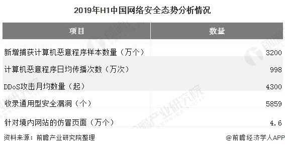 据国家互联网应急中心(CNCERT),2019年上半年,CNCERT新增捕获计算机恶意程序样本数量约3200万个,计算机恶意程序传播次数日均达约998万次,CNCERT抽样监测发现,2019年上半年我国境内峰值超过10Gbps的大流量分布式拒绝服务攻击(DDoS攻击)事件数量平均每月约4300起,同比增长18%;国家信息安全漏洞共享平台(CNVD)收录通用型安全漏洞5859个。