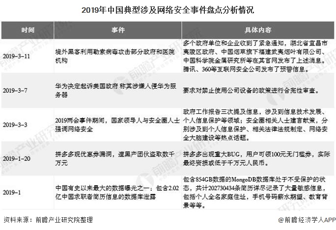 2019年上半年,发生在我国网络安全事件和威胁情况进一步加剧,各类网络安全事件数量占比仍然较高。2019年我国比较典型的网络安全事件包括:2019年3月,境外黑客利用勒索病毒攻击部分政府和医院机构;华为起诉美国政府,称其涉嫌入侵华为服务器; 2019年1月,超2亿的中国求职者简历泄露,不受保护状态持续一周等;在国家层面上,2019年两会期间,政府工作报告也多次提及信息安全。