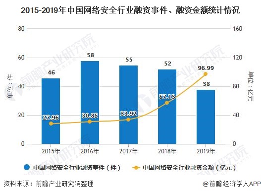 鉴于网络安全行业的良好发展前景,网络安全行业不断受到资本的青睐,我国网络安全融资金额屡创新高。2015-2019年,中国网络安全行业融资事件虽然从最高的58件下降至38件,但是融资金额却再创新高,2019年达到96.99亿元,较上一年增长约70%。2020年有望突破100亿元。
