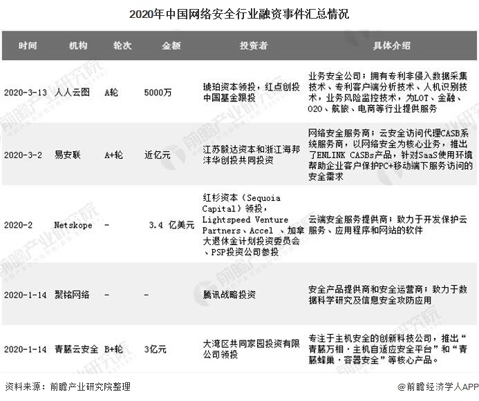 2020年,我国网络安全融资持续发生, 2020年3月,业务安全公司人人云图获得5000万A轮融资;网络安全服务商易安联获得近亿元的A+轮融资,云端安全服务提供商Netskope获得3.4亿美元的融资等。