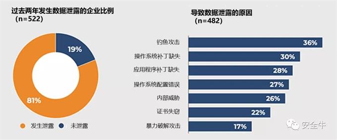 报告指出,在过去两年中,75%的企业和机构至少遭受了一次数据泄露。网络钓鱼攻击(36%)是导致数据泄露的头号原因,其余依次是: